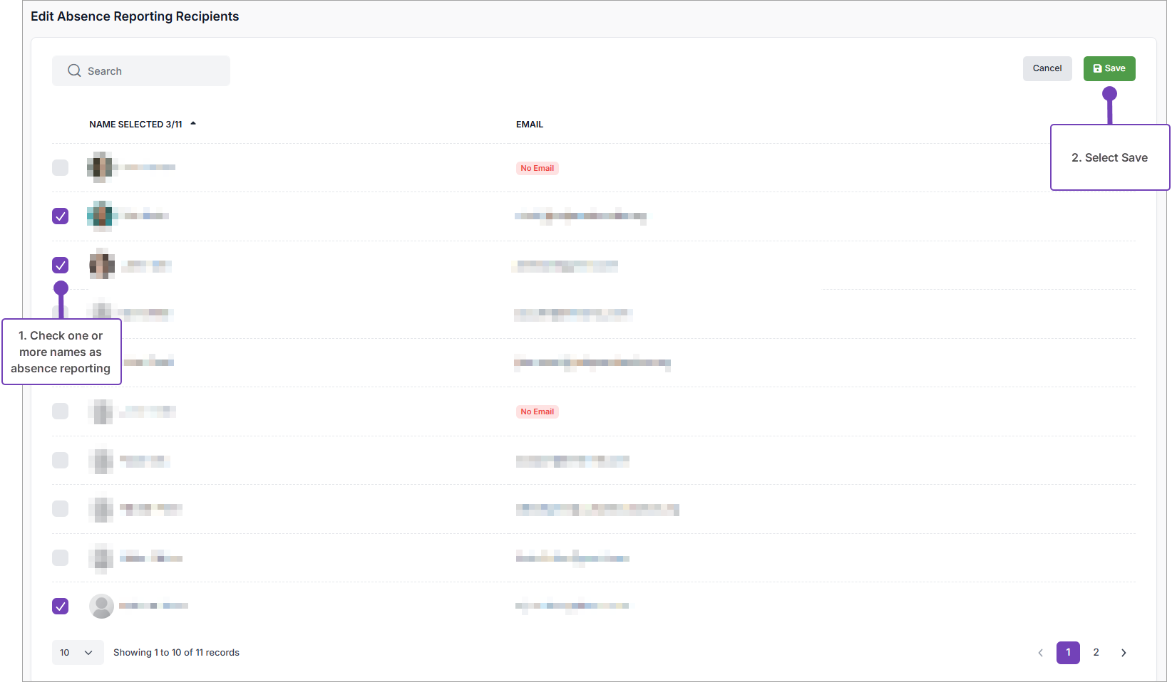 - Check one or more names of registered staff members (who have email addresses) whom you want to enable to receive absence reporting alerts.