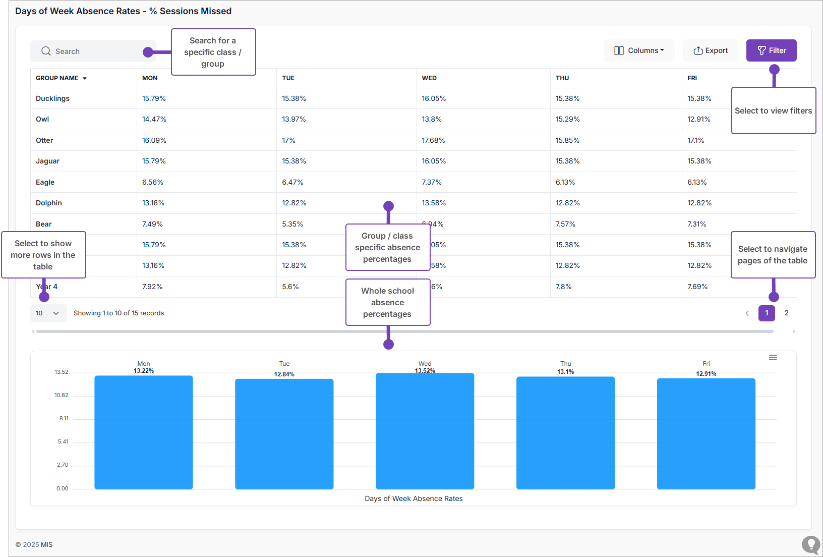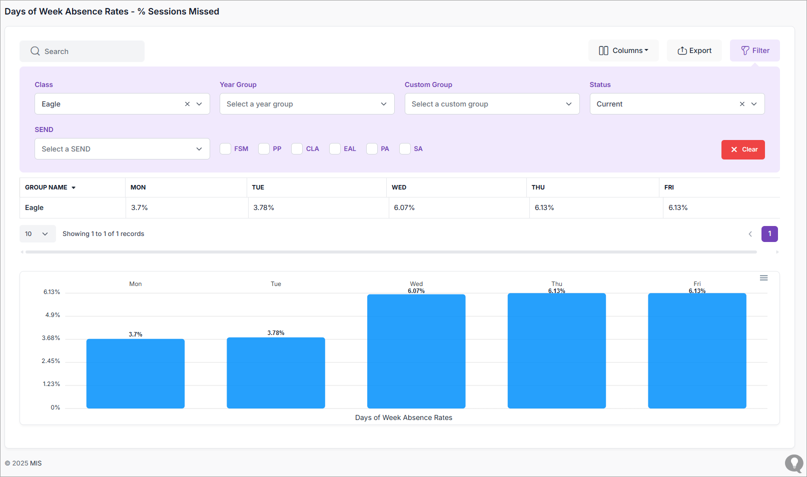 When filters are selected, the absence rates by day displayed in the table and chart reflect those choosen, for example, a class: