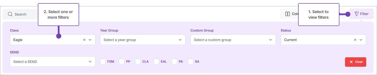 Use the filters to show absence rates for a specific pupil groups / categories, for example, a Class:
