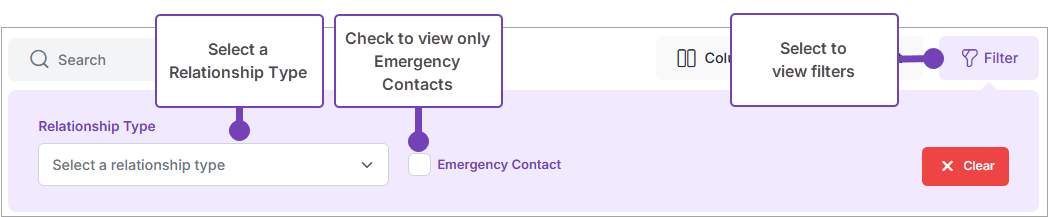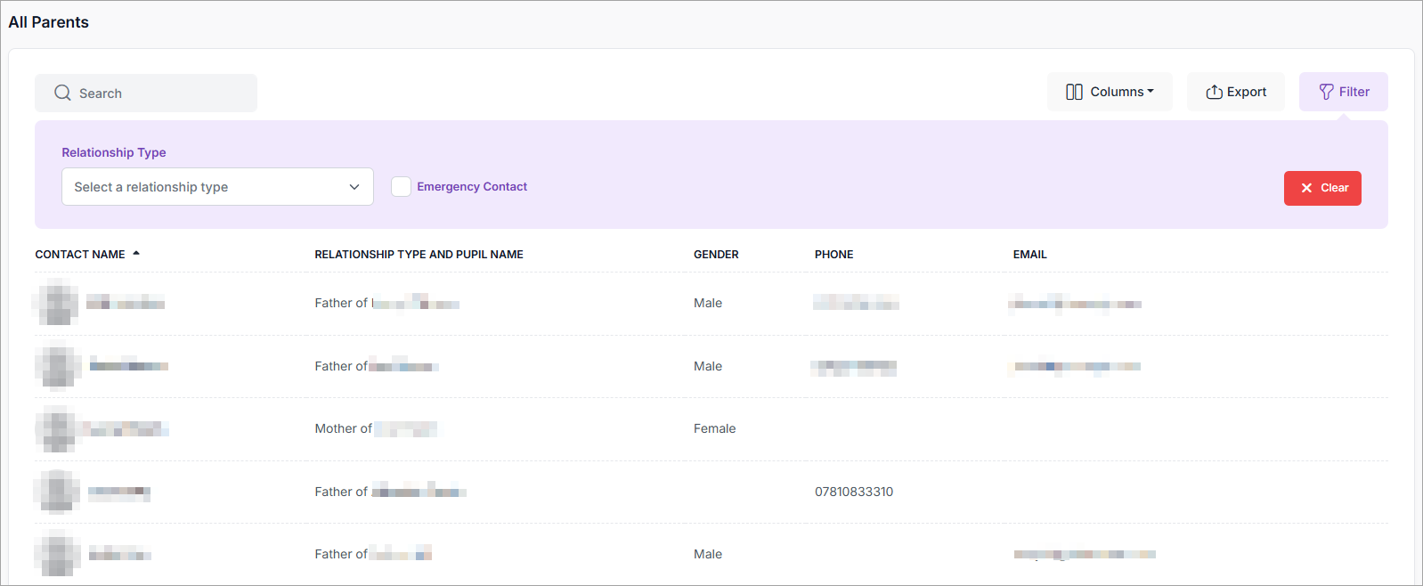 - Select Filter, and then filter by Relationship Type and whether a parent is categorised as an Emergency Contact: