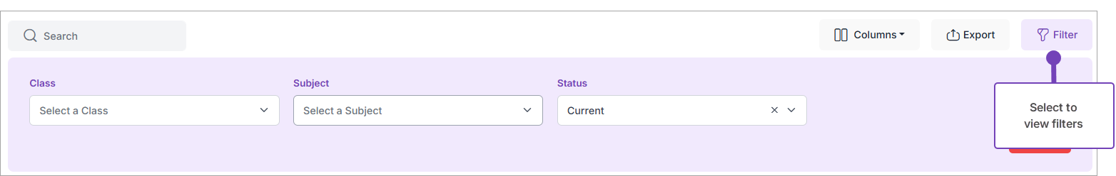 - Select Filter, and then filter by a combination of Class, Subject and employment Status as required: