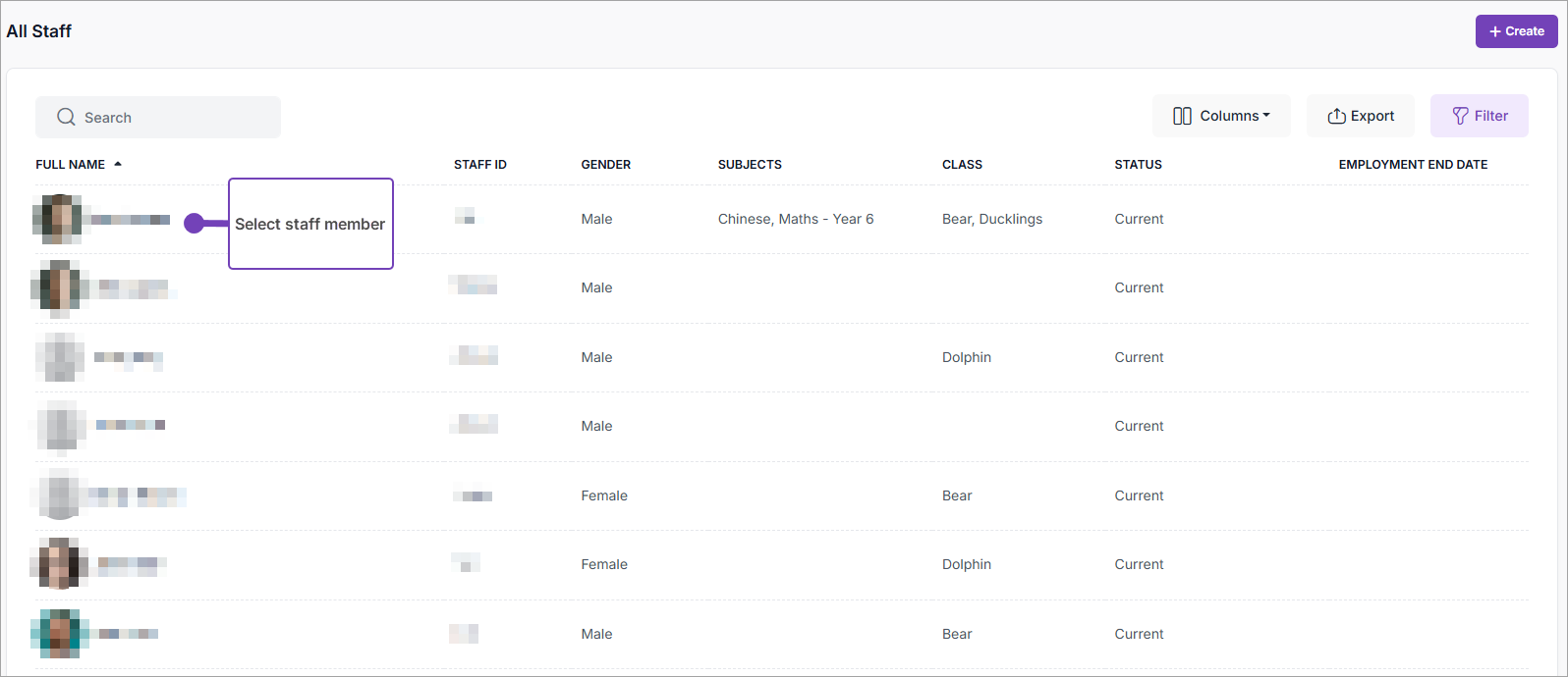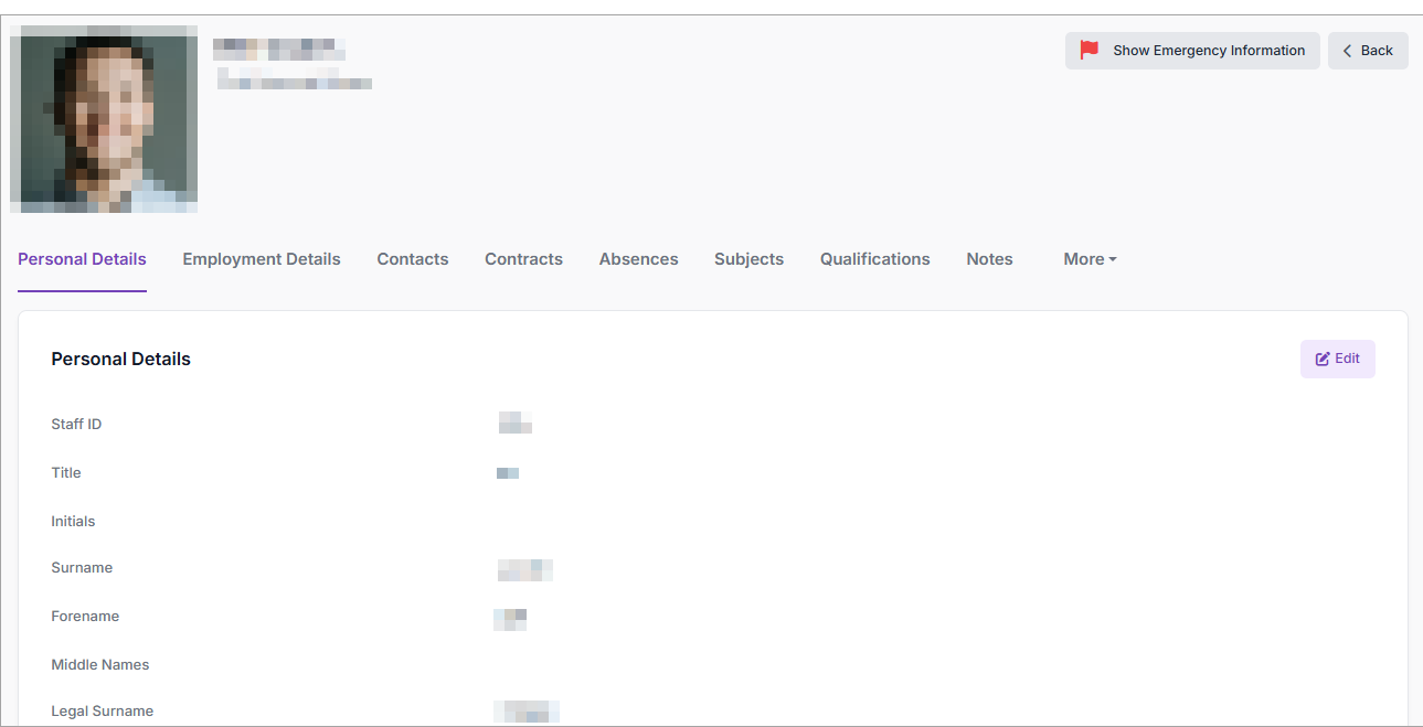 - Select the tabs across the top to view specific information, for example, employment details, contractual information, absence information, subjects, qualifications, and notes.