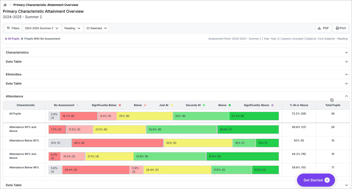 This article explains how you can compare pupil attainment for a subject based on pupils' attendance levels, using the relevant Characteristic Attainment Overview report (either the EYFS Characteristic Attainment Overview Report or the Primary Characteristic Attainment Overview Report). The report lets you view performance differences based on attendance. It shows the attainment of: