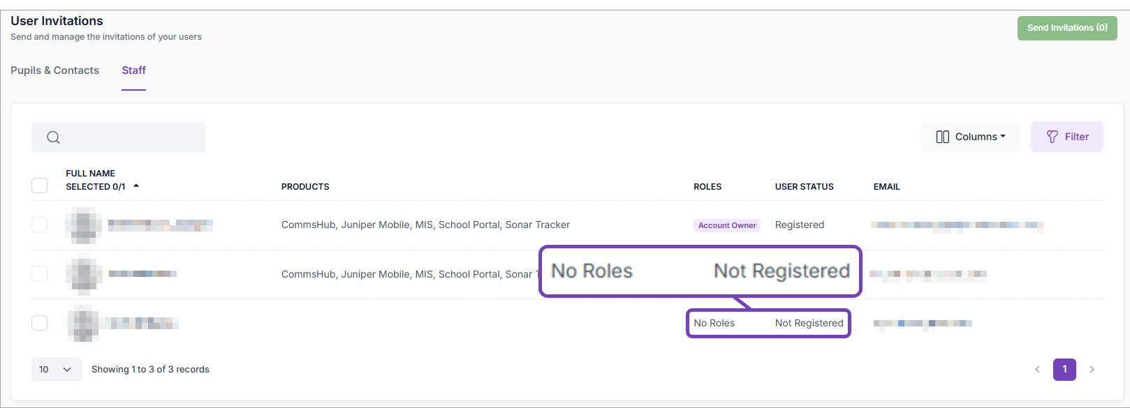 The user's access is removed from all Juniper Education products (you cannot currently revoke access from a single product). Their Roles are updated and show as No Roles, and their User Status is listed as Not Registered: