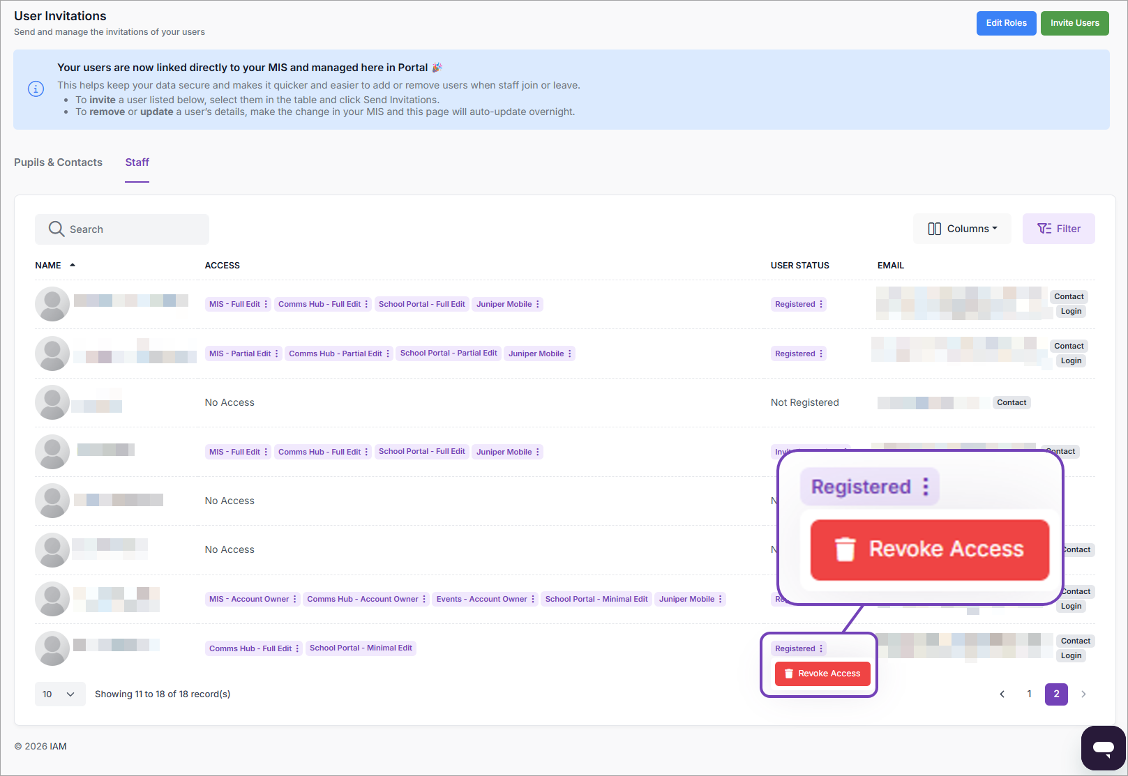 - Select the vertical ellipsis next to the staff member's User Status, then select Revoke Access.