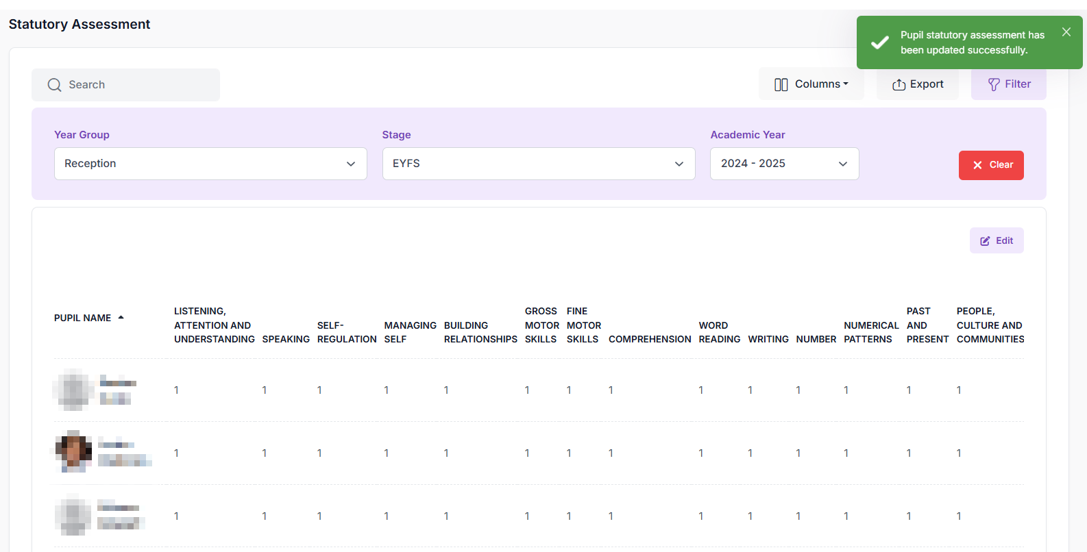 - The Statutory Assessment page refreshes, showing the pupils' latest statutory EYFS judgements: