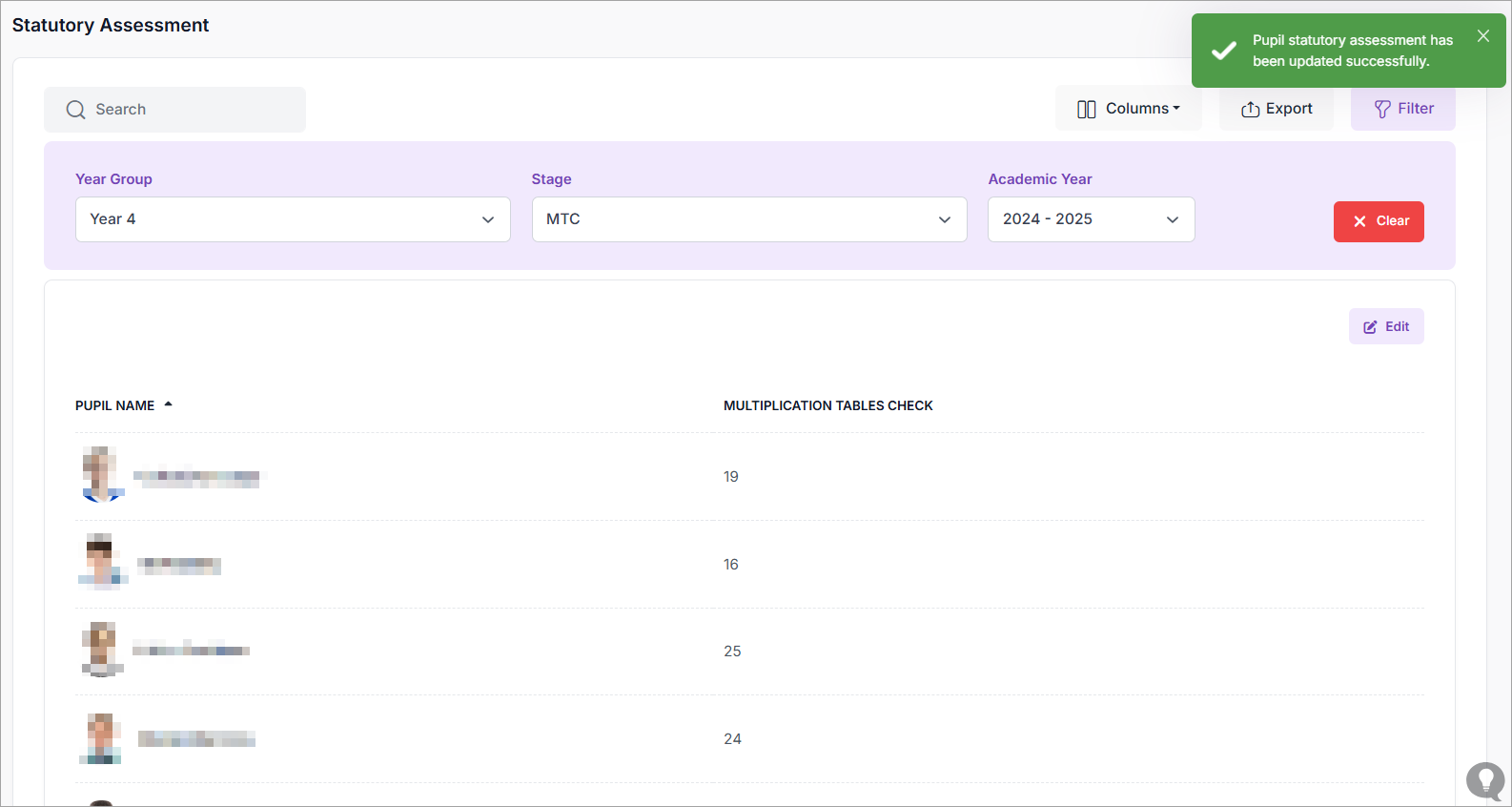 - To enter or edit Multiplication Tables Check (MTC) scores, pupils must currently be in Year 4. These scores cannot be entered or edited for pupils in any other year group.