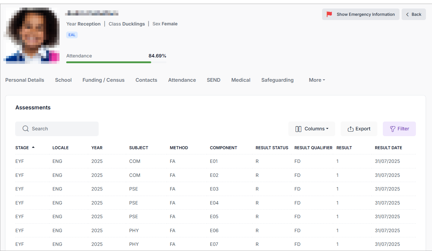 This article explains how to see a pupil's statutory assessment results from their pupil record, accessed through the All Pupil page of the Juniper MIS. The pupil's assessment results contain all recorded statutory assessment results for the pupil that have been stored in your MIS. These include all statutory assessments: EYFS, Phonics, Multiplication Tables Check (MTC), KS2 Teacher Assessments and KS2 Test Scores. Additionally, you can view the optional KS1 Teacher Assessments and KS1 Test Scores that were once statutory if your school uses and records them in Juniper MIS.