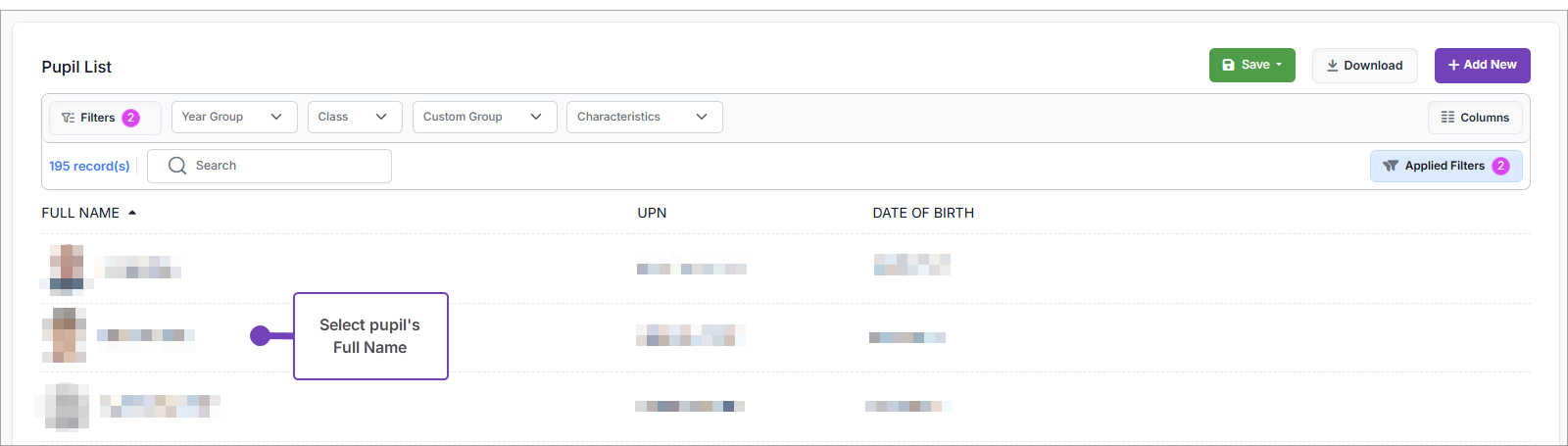 - Select the pupil's Full Name to open their profile: