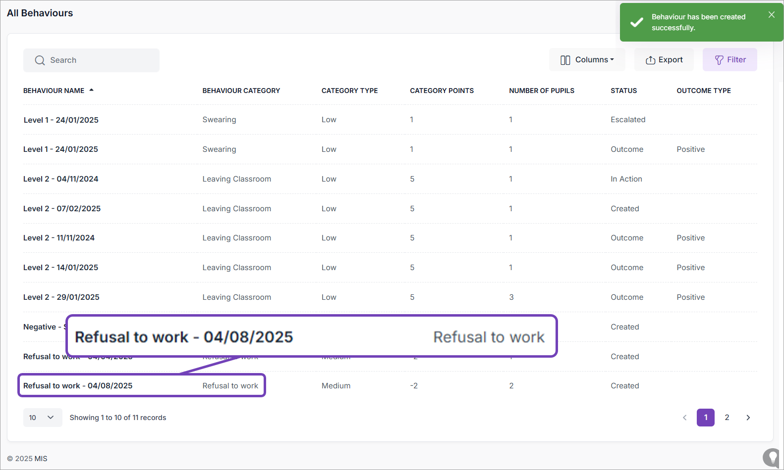 1 - Behaviour Types and Behaviour Categories are configured to meet your school's needs. To add / change these, speak to your school's MIS administrator.