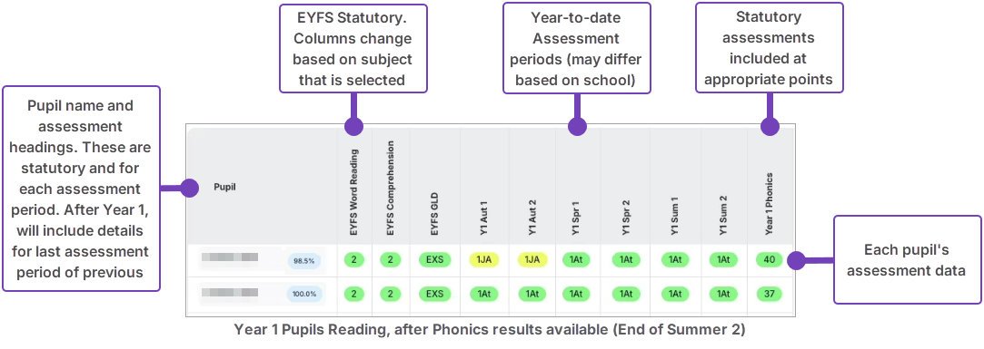 When Reading is selected using the Subject Selector, in addition to the assessments at the various assessment period throughout the current academic year, and the last assessment period of the previous years, the following columns are displayed in the table: