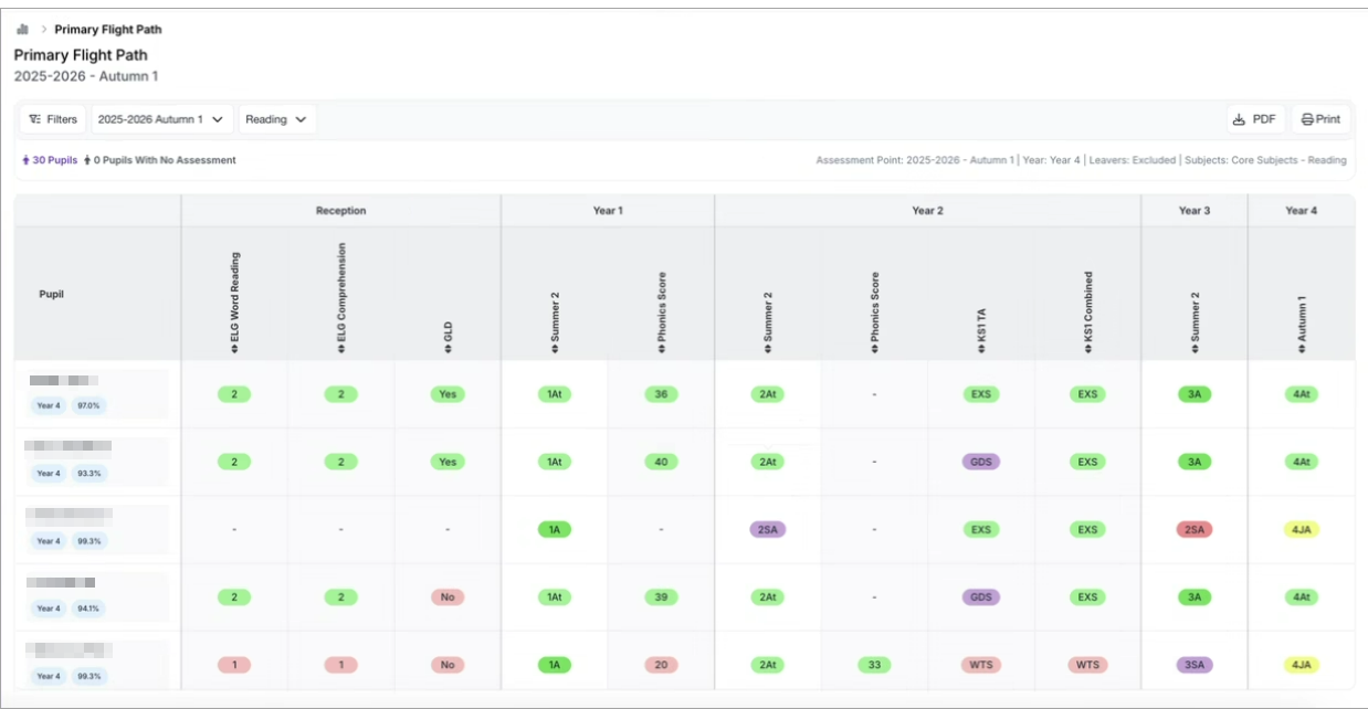 The Flight Path Report tracks pupils’ assessments over time, using statutory assessments (for example, EYFS, Phonics, and MTC) and teacher assessments. It shows expected progress, highlights trends, and helps teachers identify whether pupils are on track to meet their targets.