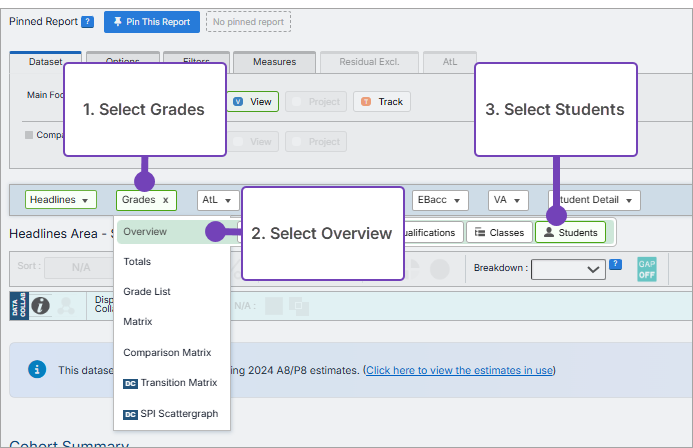 This article explains how to view the number of students who achieved a certain number of grades 9-X, for internal analysis, for example, the number or percentage of students who achieved 5+ grades 9-7. This is done through the Grades area of KS3/4 reports.