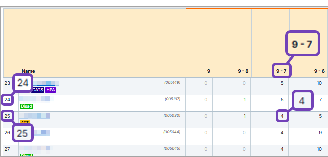 For example, if you're looking for the number of students who achieved 5+ grades 9-7, then you would scroll down to find the first student to achieve 4 grades 9-7, then the number of students above this student would be the number of students who achieved 5+ 9-7 grades. In the below example, the student listed row 25 is the first student to achieve less than 5 grades 9-7, so the number of students above 4 grades 9-7 is 24.