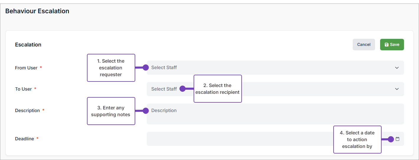 - Complete all of the Behaviour Escalation details: