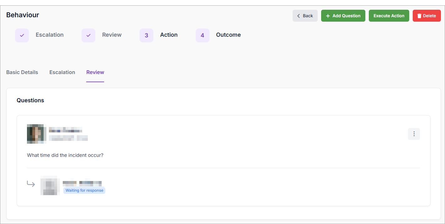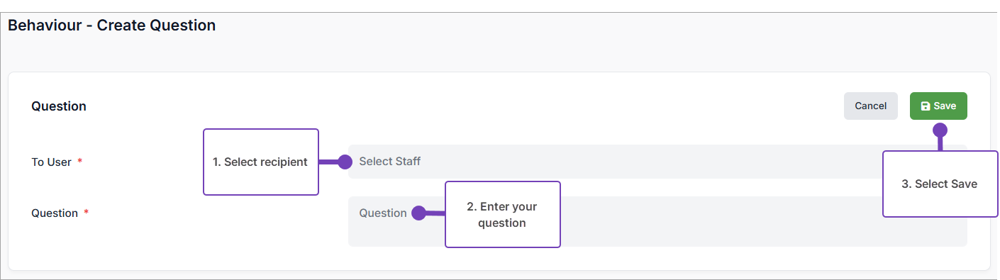 - Select Save to send the question to your colleague. It is recorded in the Review tab of the Behaviour: