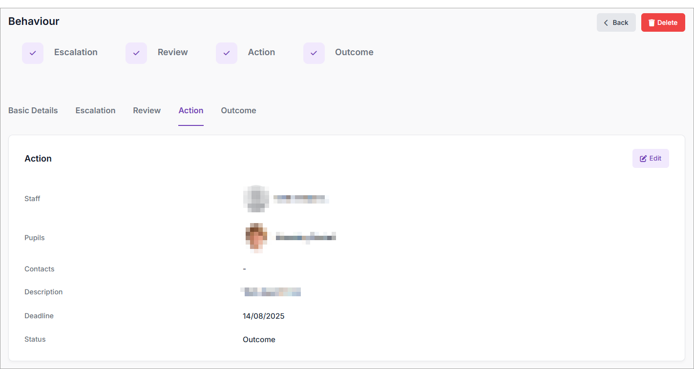 This article explains how to update a record created for a Behaviour incident involving one or more pupils, and optionally members of staff. When updating a record, you can: