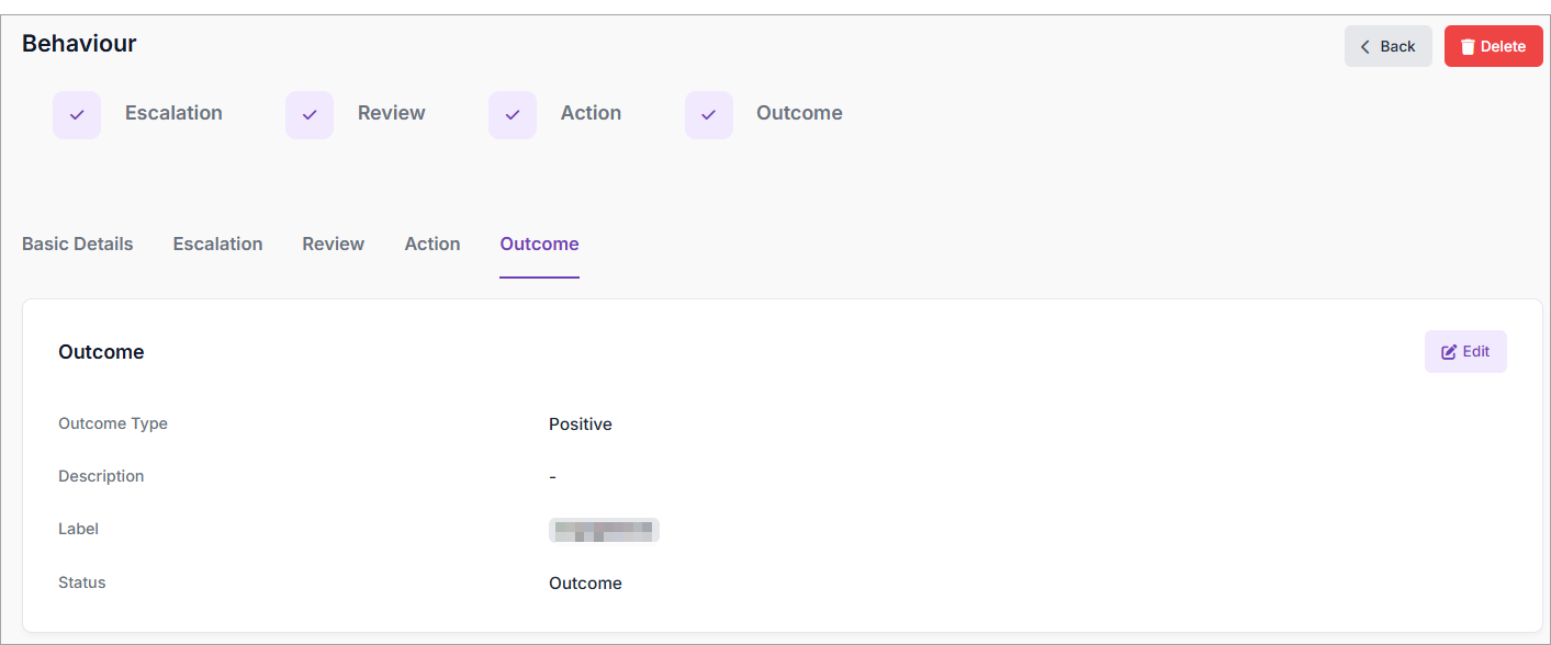 - Select Save. The Behaviour is saved and a confirmation message is displayed. Your outcome is recorded in the Outcome tab of the Behaviour: