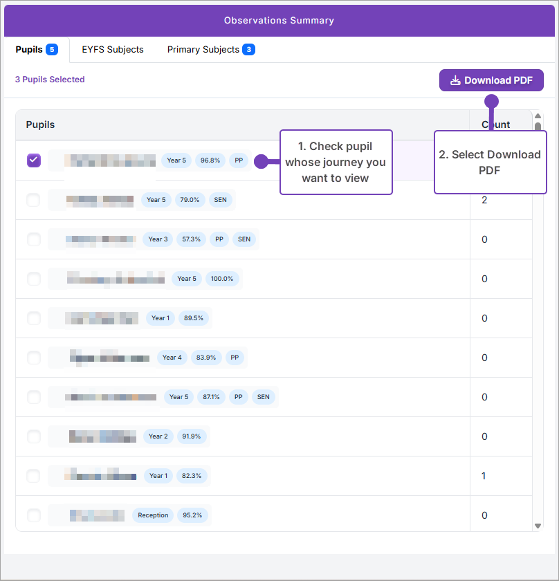 This article explains how to download all observations for a pupil as a PDF in Sonar Tracker. This PDF contains all pupil observations in chronological order, forming their learning journey. When the PDF file is downloaded, you can print it from your device or share with others, for example, by emailing it to a parent.