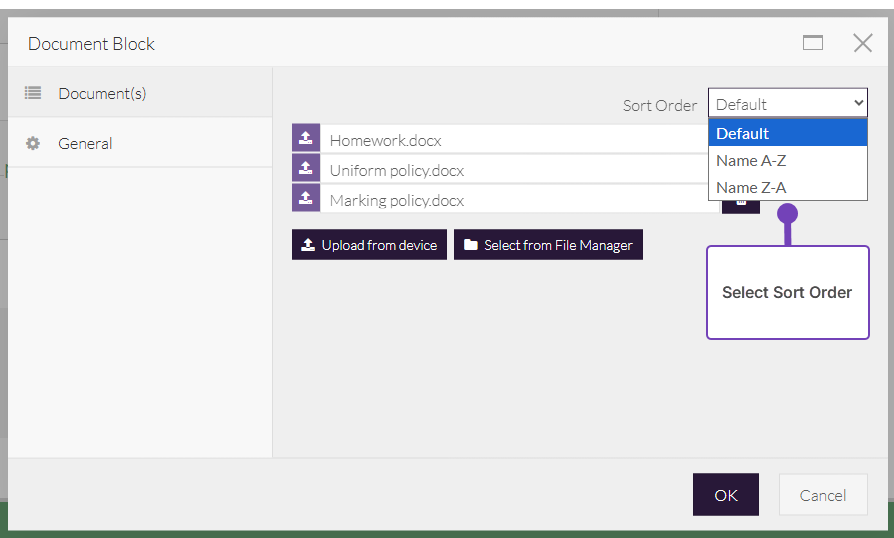 - By default, the files / documents will be displayed in the order that they have been uploaded. If you would like to change this order: