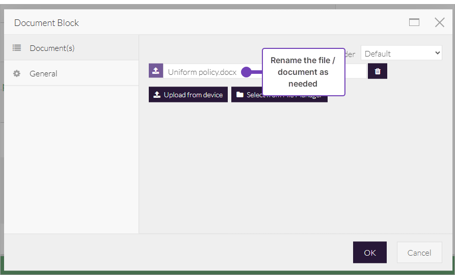 - Select General if you'd like to include a title for the block, or if you're an FED and want to change the template to one you have uploaded: