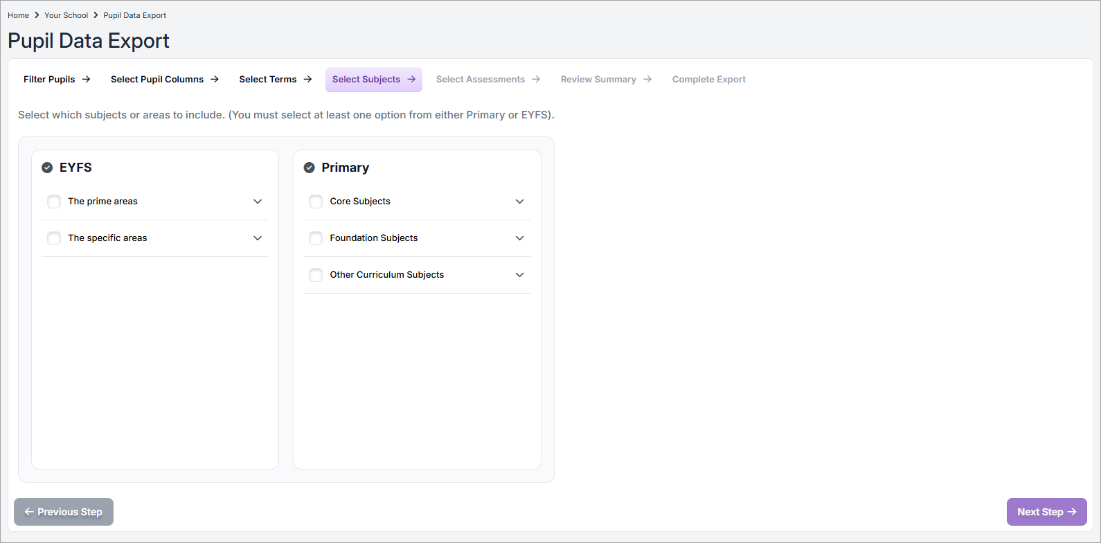 - Select one or more subjects whose data you want to include. You can choose EYFS subjects, Primary subjects, or both. Expand the areas as required.
