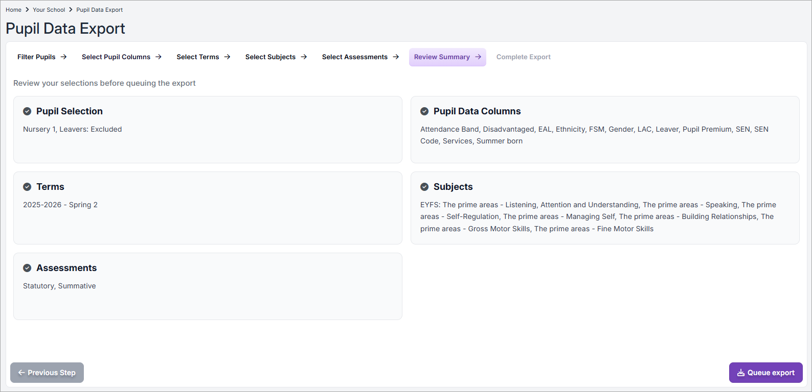 - Review the summary of the data that is going to be exported in your report (based on your selections above).