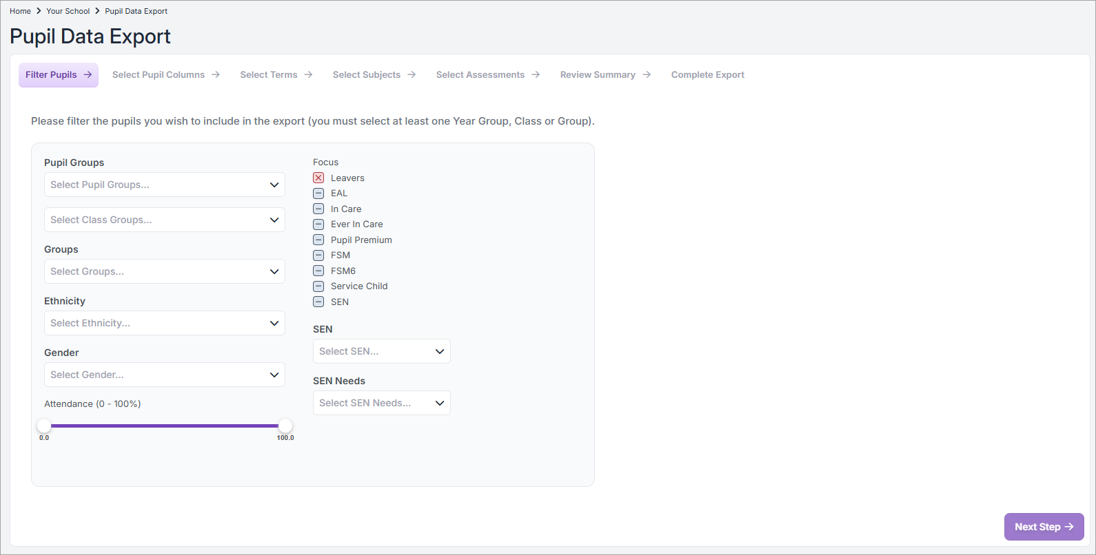 - Select one or more Pupil Groups, and optionally select any of the filters, for example, ethnicity groups, gender, attendance, focus groups, or SEN details.