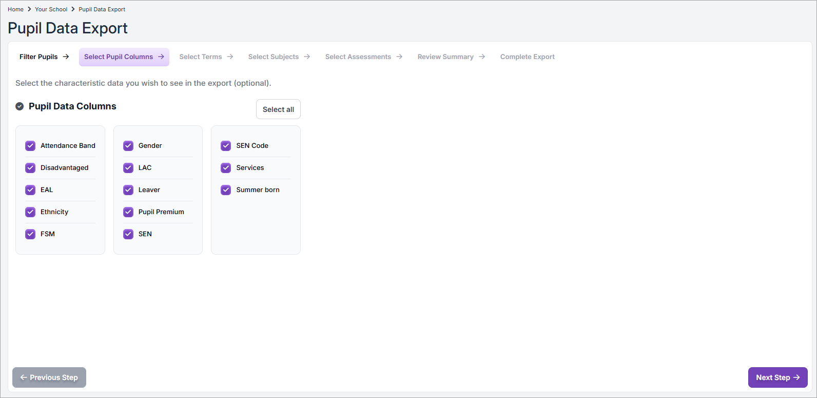 - Optionally, check / uncheck the Pupil Data Columns that you want to display as columns in your report.