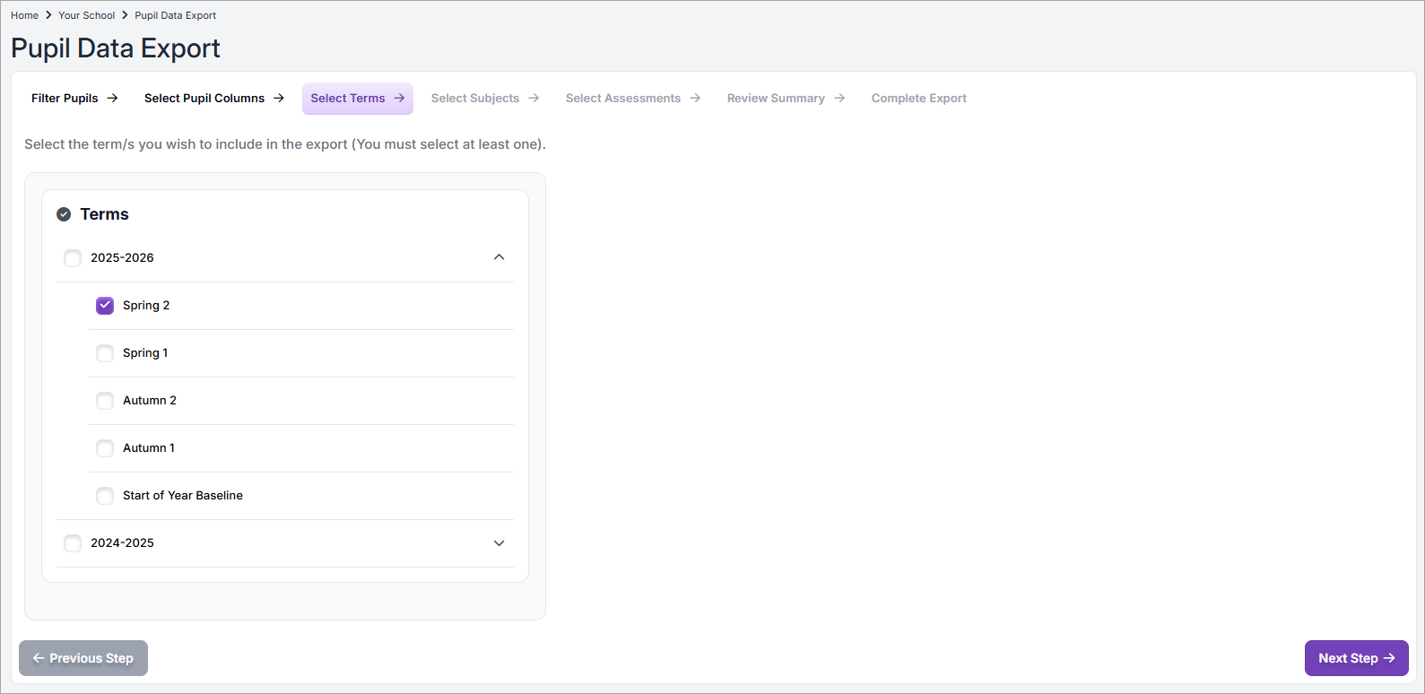 - Select one or more terms from this or previous academic years.