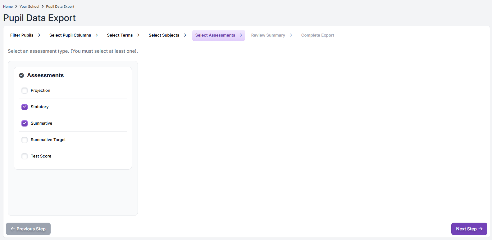 - Select one or more Assessment for the assessment data that you want to include. Select one or more from Statutory, Summative, Summative Targets and Test Paper.