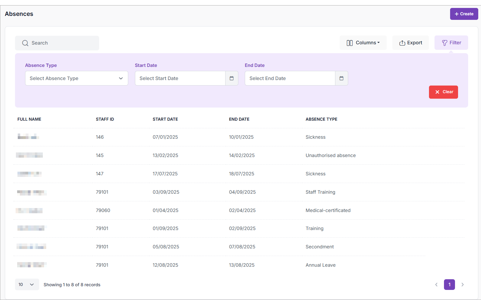 A list of all staff absences is displayed:
