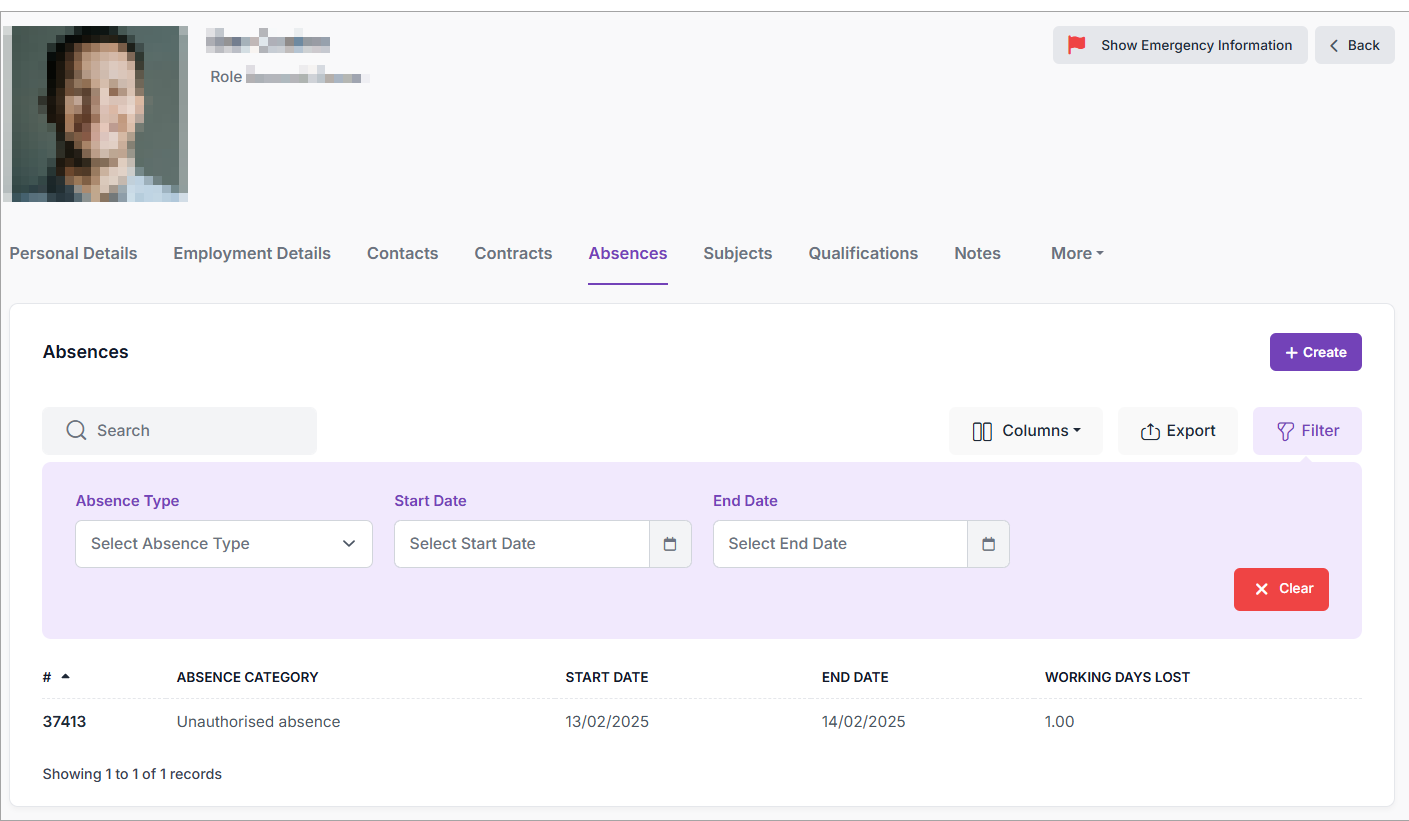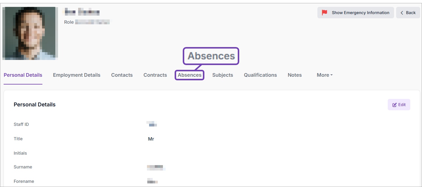 This article explains how to view a list of all staff absences recorded for an individual staff member from their staff record.