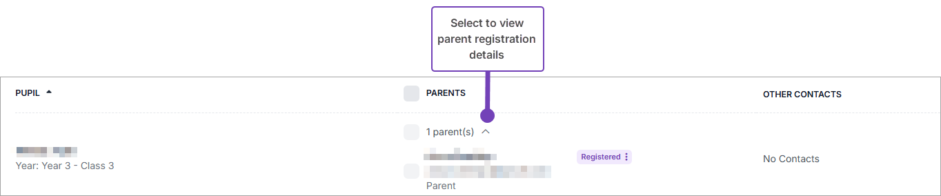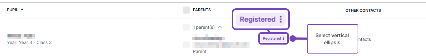 - In the Pupils & Contacts tab, locate the pupil for whom you want to revoke the parents' access.