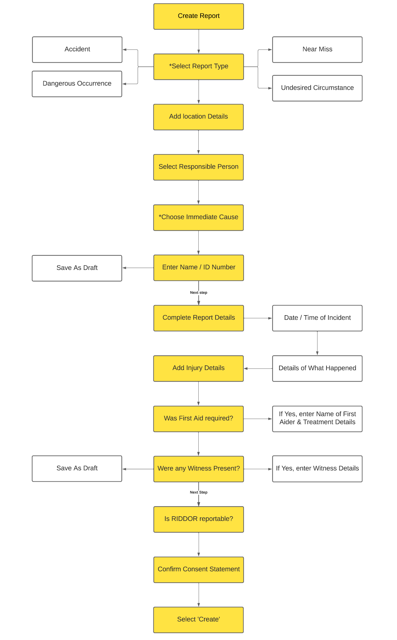 Follow the steps in this flowchart to create an accident or incident report (select to enlarge):