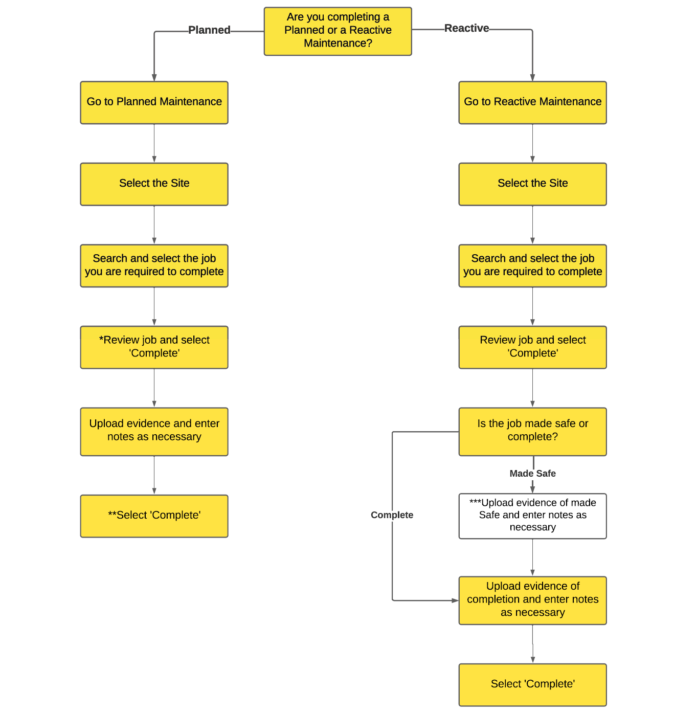 Follow the steps in this flowchart to complete a Planned or Reactive Maintenance Job (select to enlarge):