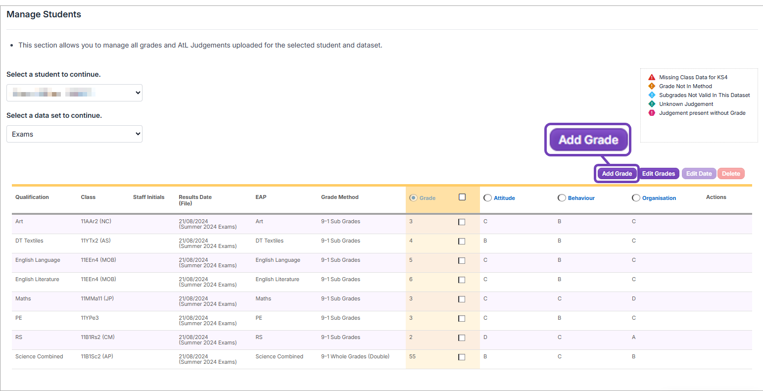 If a student resits a qualification in KS3/4 or KS5, add or upload the new grade(s) using the instructions below. If a student has two grades for the same qualification in KS3/4, Analytics will count the grade with the earliest ‘Exams date’ towards school performance measures, in line with DfE guidance, and the best/highest grade towards individual student performance. If a student has two grades for the same qualification in KS5, Analytics will count the best/highest grade towards school performance measures, in line with DfE guidance, and towards individual student performance.