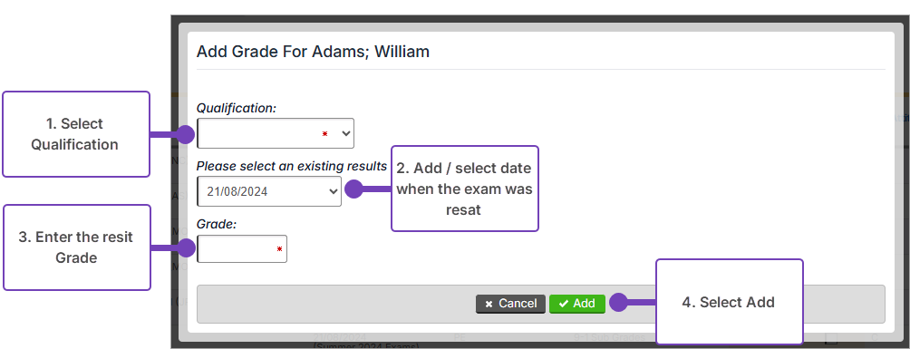 - Repeat Step 8 to Step 9 for each qualification the pupil has resat.