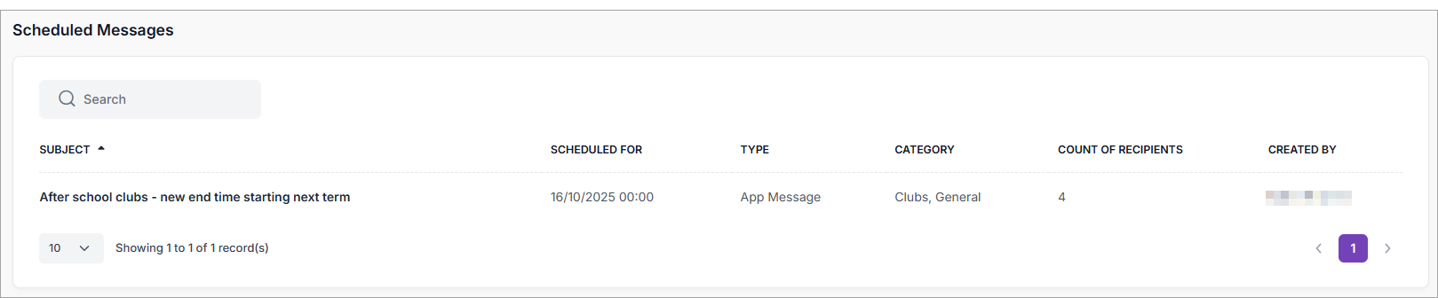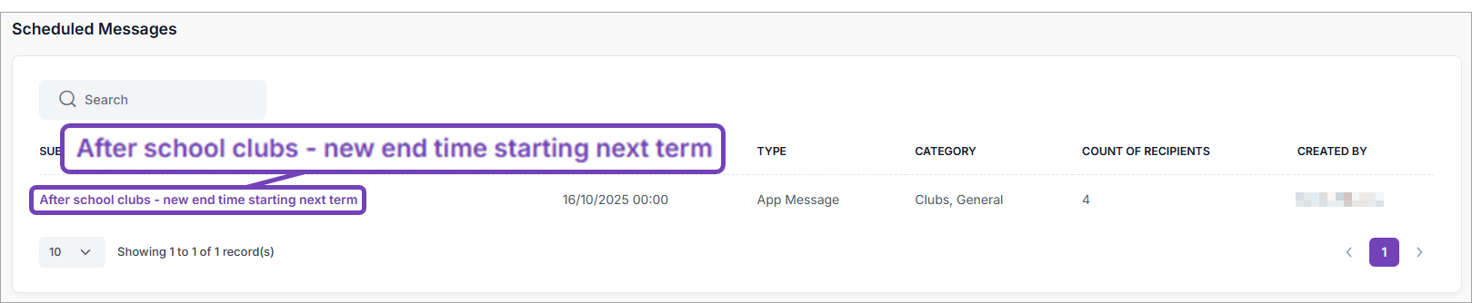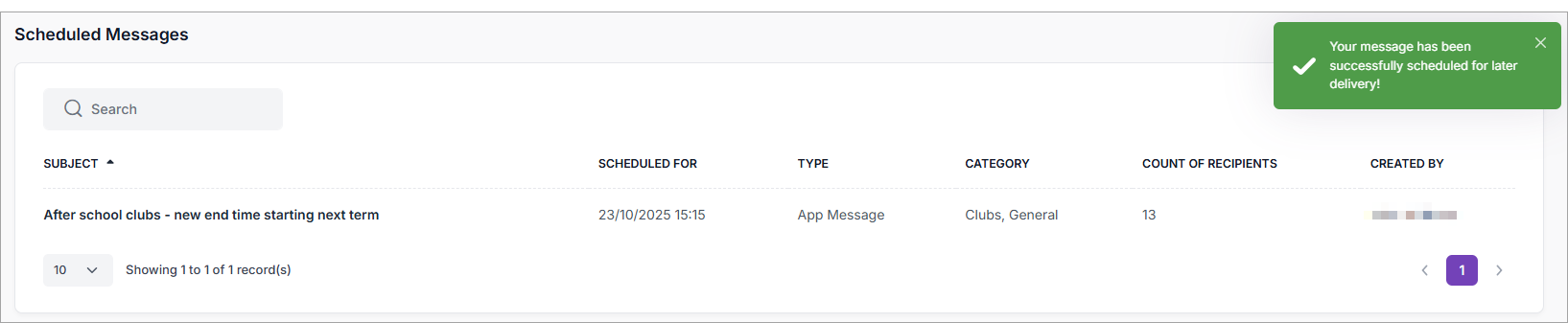 The message is rescheduled. You are returned to Scheduled Messages where a confirmation message is displayed, and the rescheduled message is added to the list including details of its publication date and time: