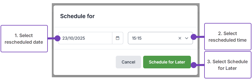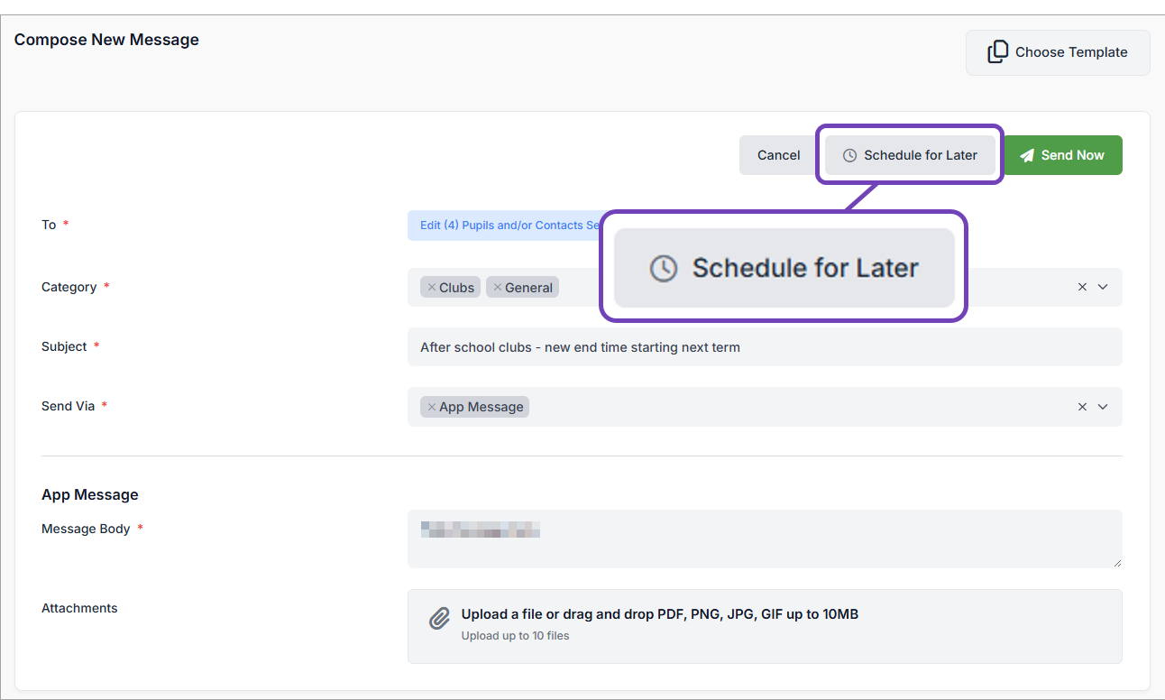 - The message opens in the Compose New Message view. Select Schedule for Later:
