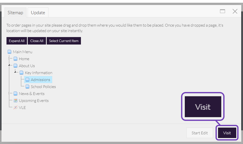 - Select the page, then select Visit: