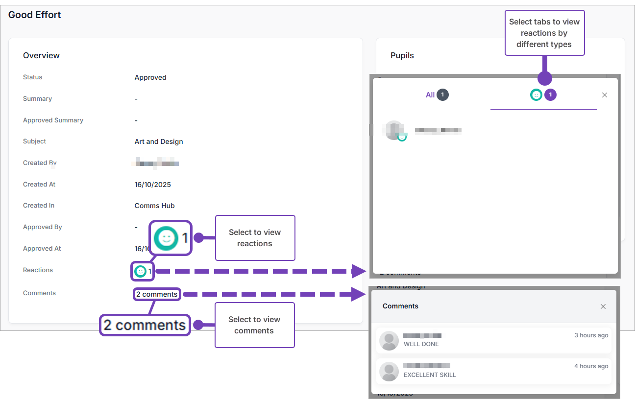 Within Comms Hub, follow these steps to see comments and reactions recorded against badges: