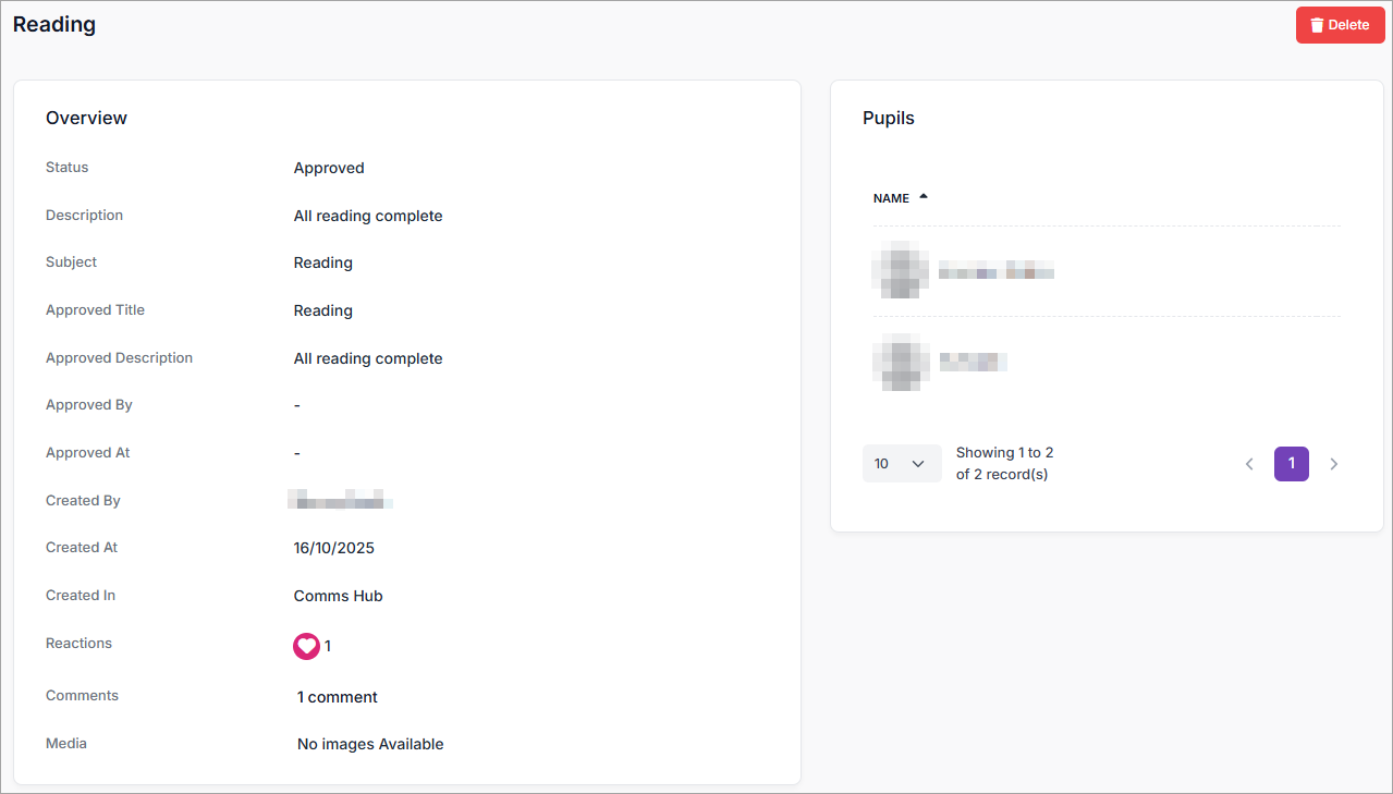 When multiple pupils are tagged into an observation, all parents of the different pupils can react and comment. If you would prefer parents to see only reactions and comments they've made about their child, create a separate observation for each pupil.