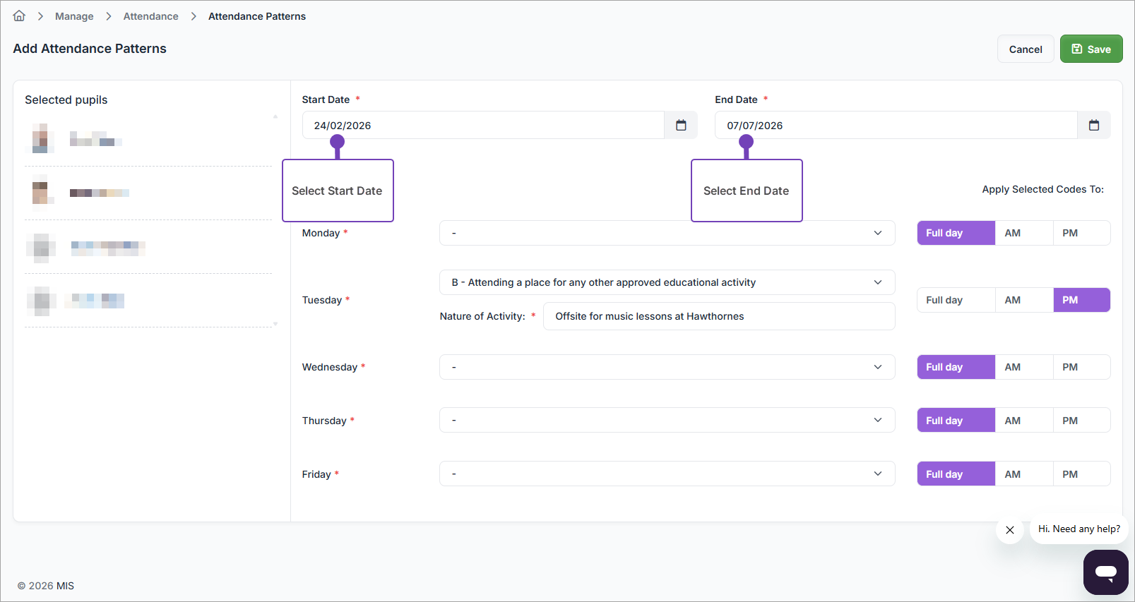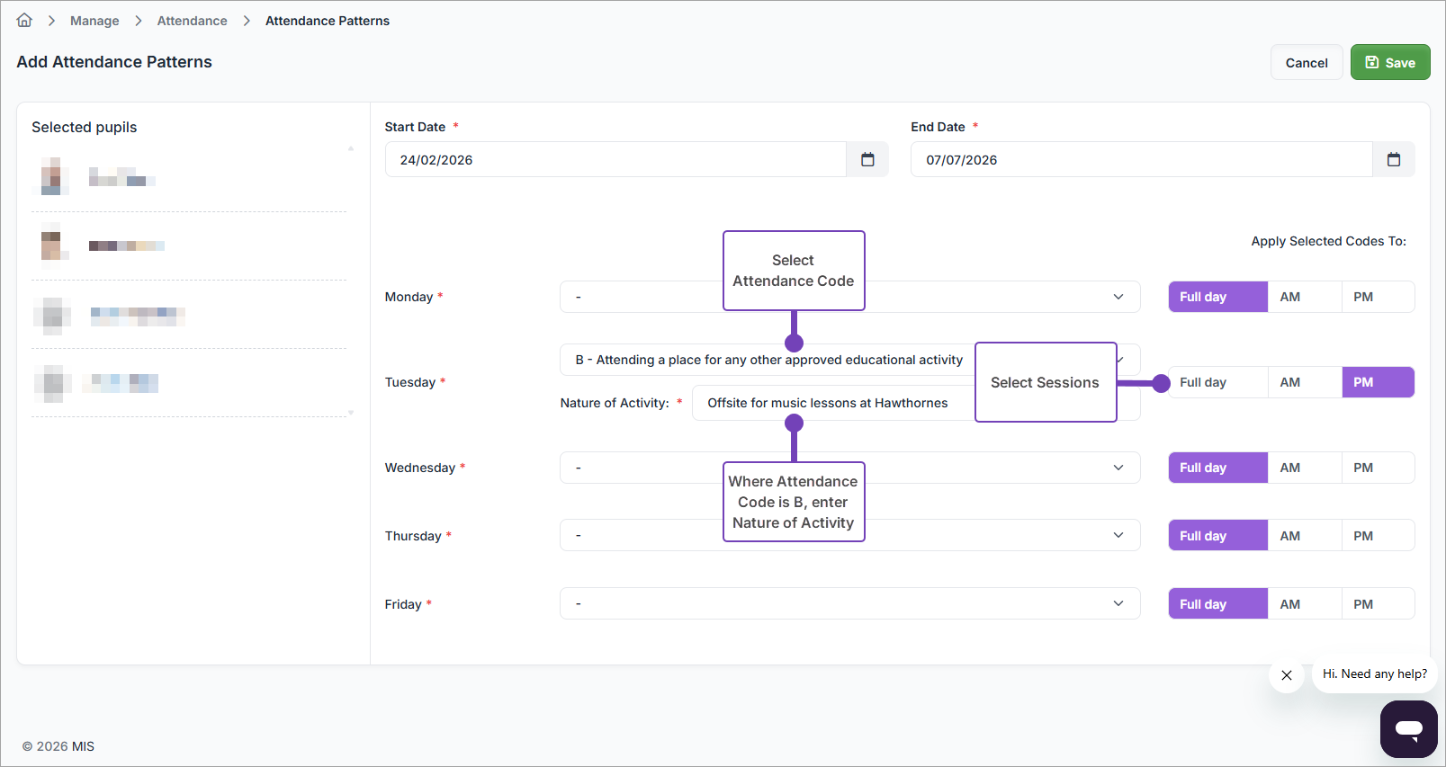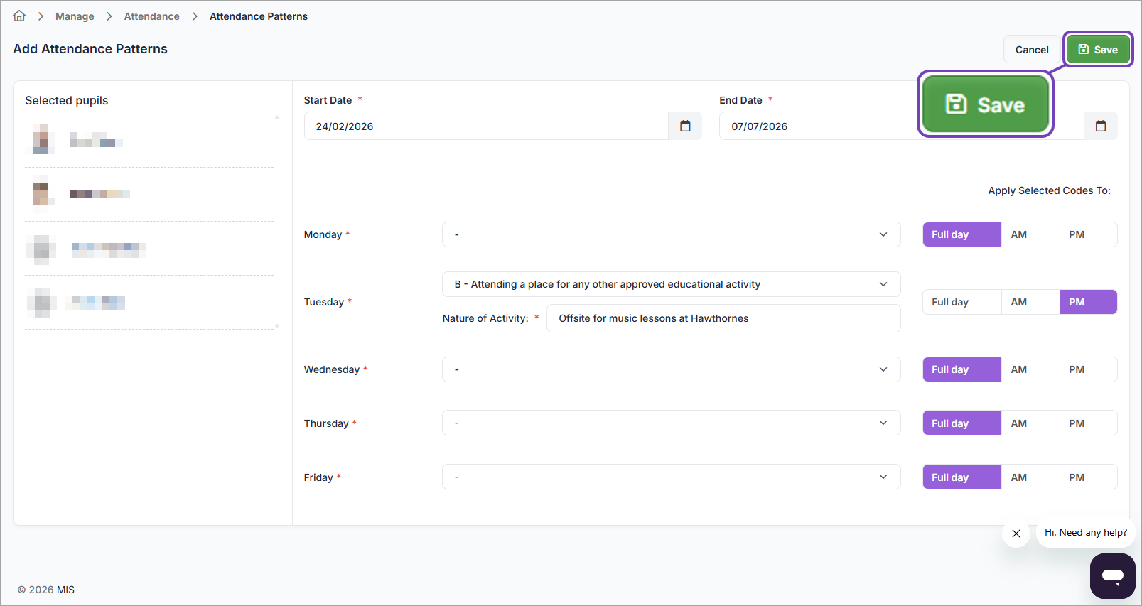 After adding an Attendance Pattern for one or more pupils, class registers will be automatically populated with the appropriate Attendance Codes between the specified dates, saving teachers the need to enter this information when registering pupils. This eliminates the need for teachers to enter B, D or X codes.