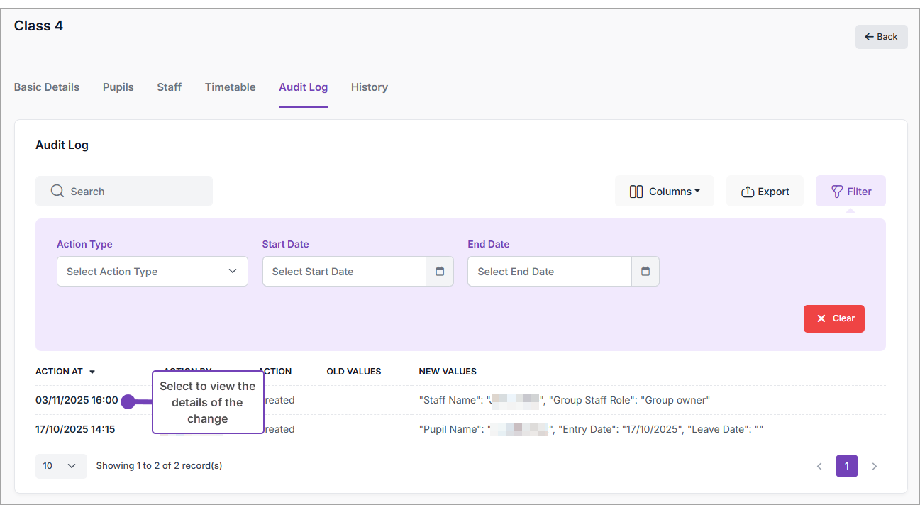 - Select Filters to specify a date range (Start Date to End Date), the Object Type (Pupil, Staff, Group or Contact) and the Action Type (Created, Updated or Deleted).