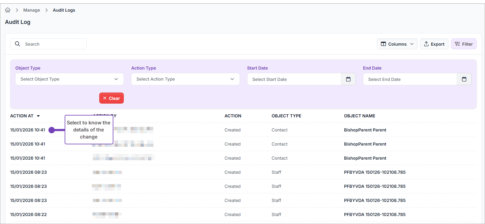 - Select Filters to specify a date range (Start Date to End Date), the Object Type (Pupil, Staff, Group or Contact) and the Action Type (Created, Updated or Deleted).