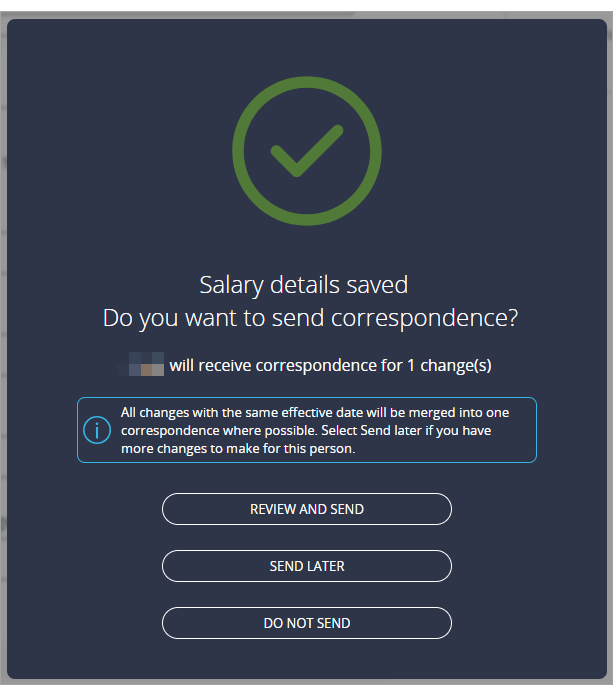 The employee's salary details are updated. When prompted, select whether to send correspondence to the employee about the changes you have made to their salary details: