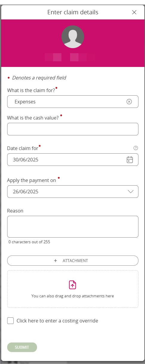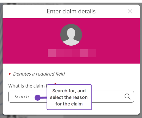 - Search for, and select a reason for the claim, for example, general out of pocket Expenses: