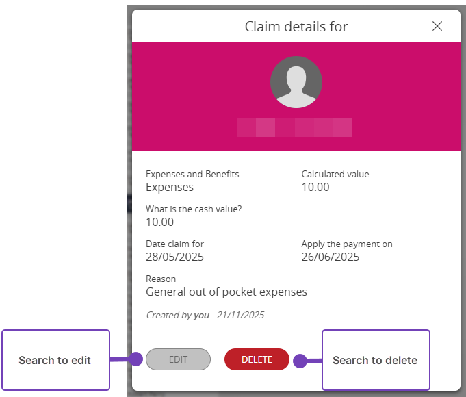 - To delete the claim, select it, then from the Claim details for window select Delete. When prompted, select Yes to confirm the deletion.