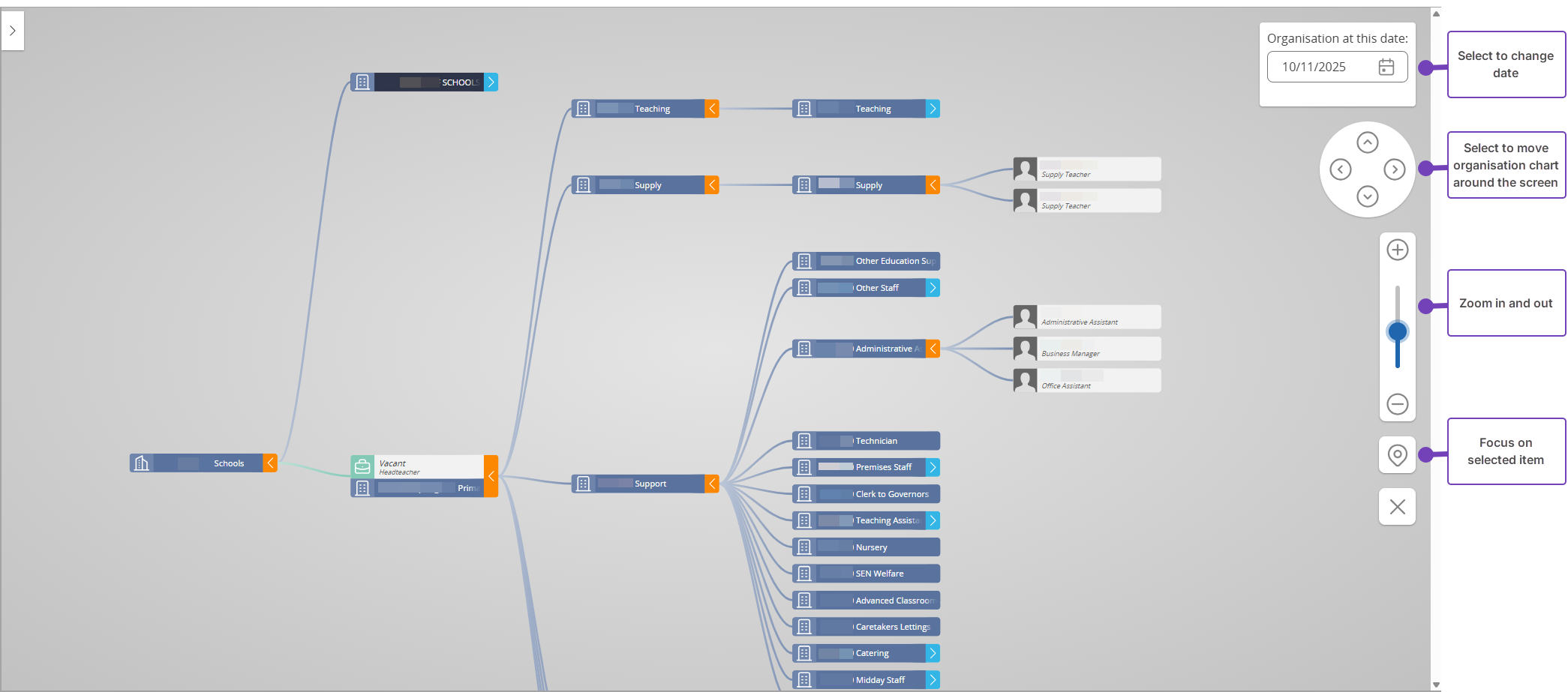 - Use the controls to the right of the screen to navigate around the organisation chart.